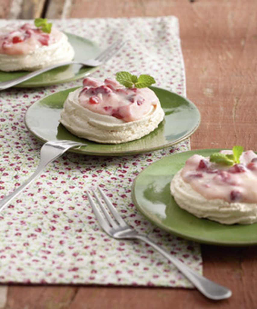 - Retire os merengues do forno e deixe esfriar um pouco. Recheie cada merengue com o creme de morango e retorne à geladeira por cerca de 2 horas, ou até que estejam firmes e prontos para serem servidos.