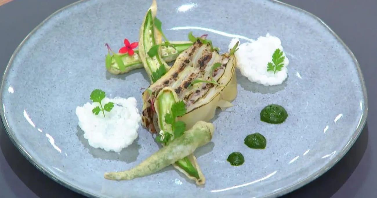 - Fatie o quiabo ao meio na longitudinal. E posicione cruzado sobre o mil folhas. Coloque pedaços do crocante e pingos de coulis de agrião.