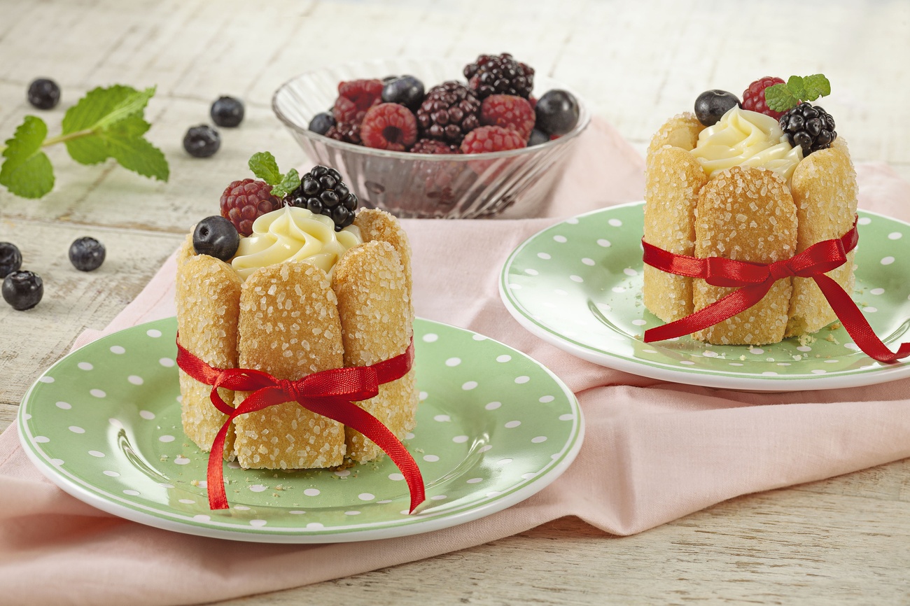 - Agora, adicione um pouco das frutas vermelhas sobre o bolo, depois coloque mais uma porção de MOÇA de Colher. Finalize o seu Mini Charlote com mais frutas vermelhas. Leve à geladeira antes de servir para que os sabores se misturem e o doce fique ainda mais gostoso.
