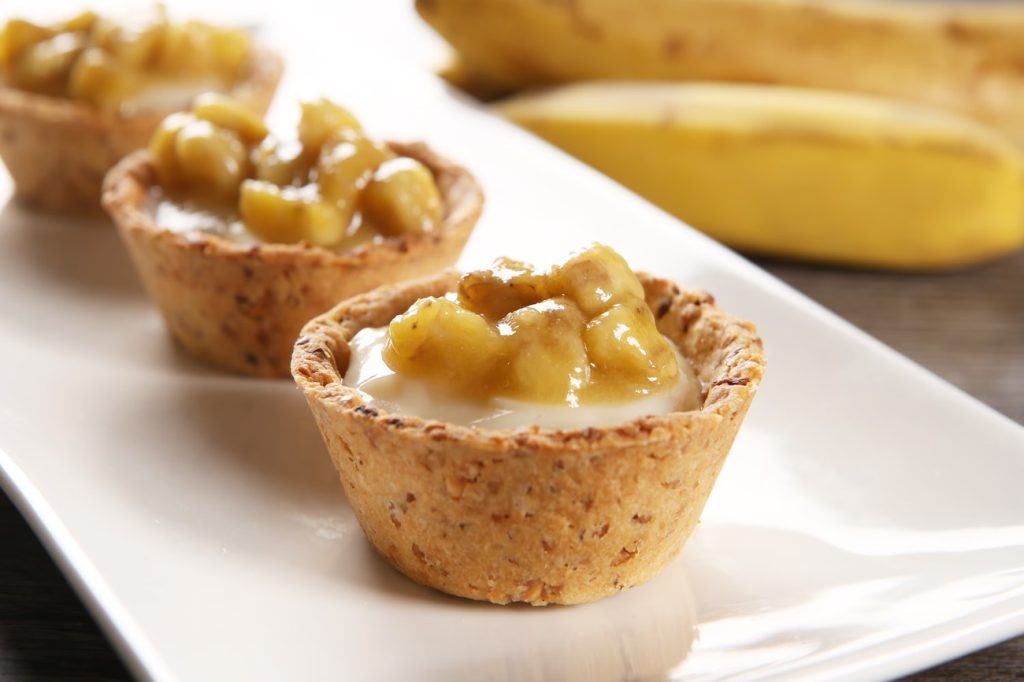 - Assim que todos os componentes estiverem prontos e esfriados, divida o creme de mel entre as fôrmas com a massa assada e coloque 1 colher (sopa) da cobertura de banana sobre cada uma. Leve as tortas à geladeira por pelo menos 2 horas para que todos os sabores se misturem e a textura fique perfeita. Sirva gelada e aproveite!