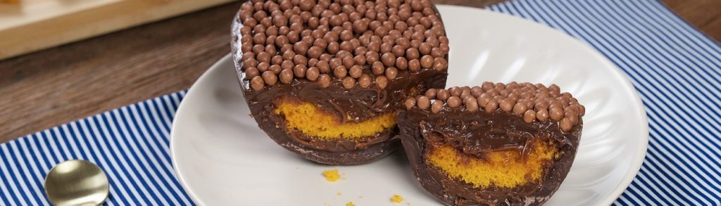 - Finalize o Ovo de Páscoa recheado com bolo de cenoura espalhando os confeitos de chocolate por cima. Esses confeitos não apenas adicionam um toque colorido, mas também um sabor agradável e textura crocante.