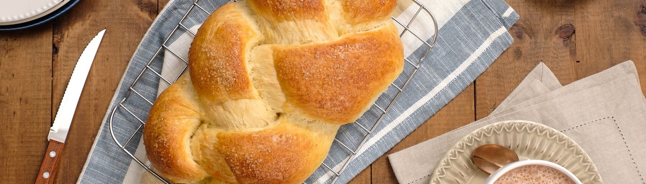 - Pincele a superfície da trança com uma gema batida e polvilhe com açúcar cristal.
