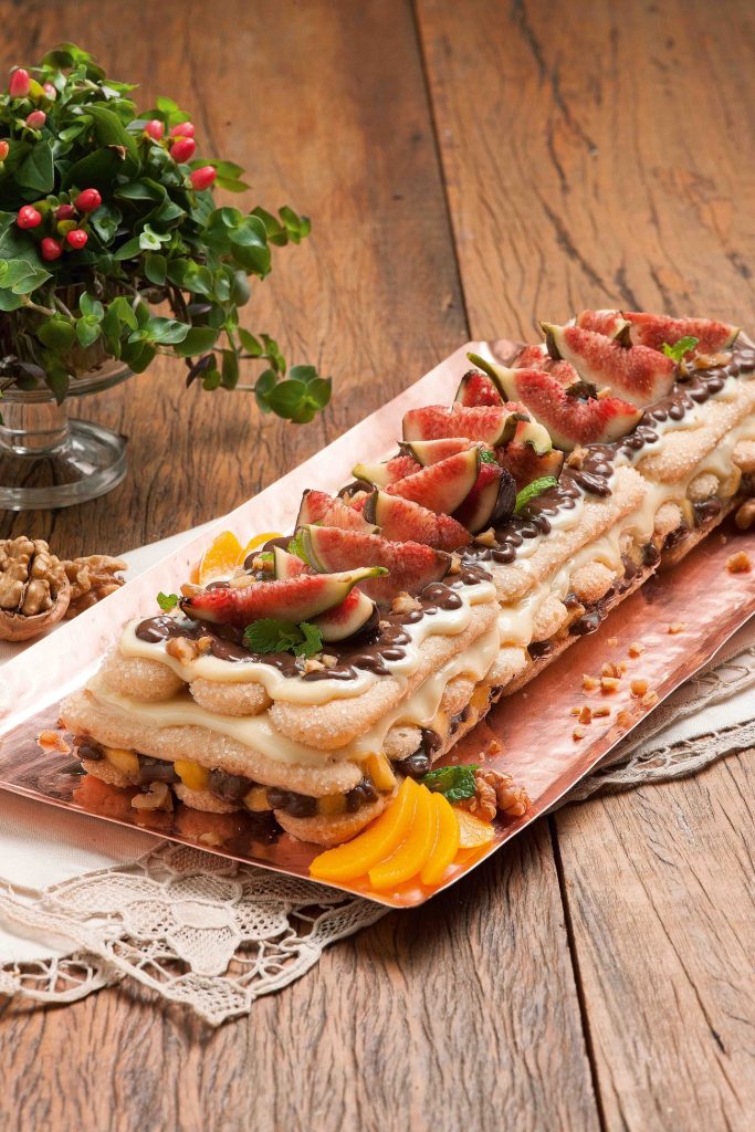 - Decore o pavê com fatias de pêssego, figos cortados ao meio e nozes cortadas ao meio.
