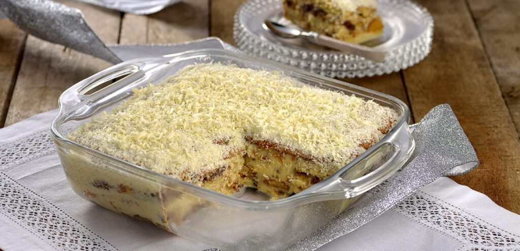 - Em um refratário quadrado médio (25 cm), disponha metade das fatias do bolo, regue com meia xícara (chá) do leite e espalhe meia xícara (chá) do creme.
