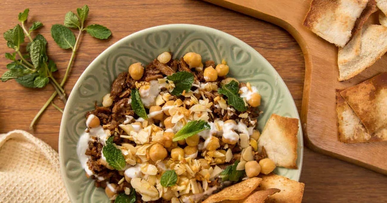 - Para a montagem, acomode a carne desfiada em um prato. Espalhe os grãos-de-bico cozidos por cima, seguido pela coalhada fresca ou iogurte natural.