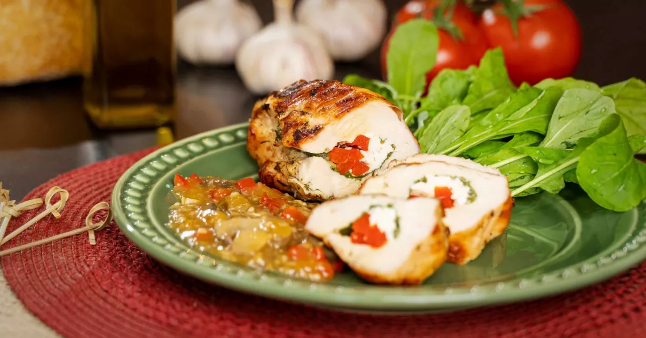 - Misture até engrossar o caldo. Sirva com o peito recheado.