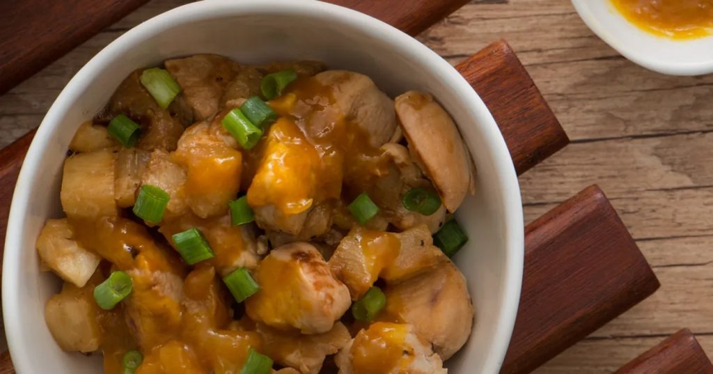 - Sirva o molho sobre o frango com abacaxi e finalize salpicando a cebolinha.