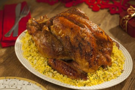 - Retire o papel-alumínio e regue o peru com um pouco do molho de vinho que se formou na assadeira. Deixe cozinhar por mais 15 minutos, ou até que a carne esteja dourada e cozida ao seu gosto.
