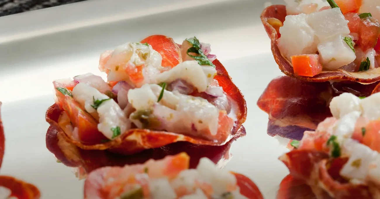 - Em forminhas para empada, coloque as fatias de copa, formando “conchinhas” e leve ao forno a 220°C por 10 minutos, até que fiquem crocantes. Reserve as copas crocantes.