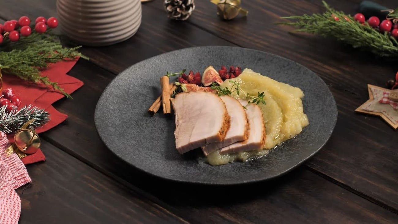 - Retire o pernil do forno, deixe descansar por 10 minutos antes de fatiar. Sirva o pernil fatiado acompanhado do purê de maçã e batata, regando com o caldo quente do assado.
