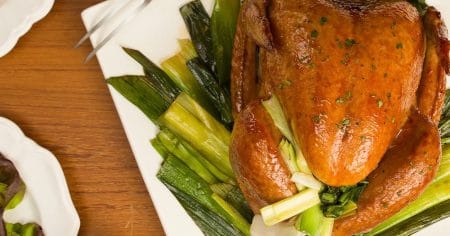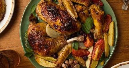 - Disponha as lascas de peru e os vegetais em uma travessa para servir e apresente com o molho.