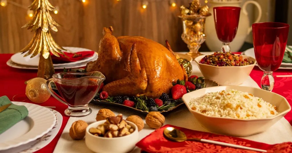 - Sirva o Peru Perdigão em uma travessa grande, decorado com frutas e ervas frescas, acompanhado do molho de frutas vermelhas. Farofa e salada de lentilha também acompanham bem esse prato.