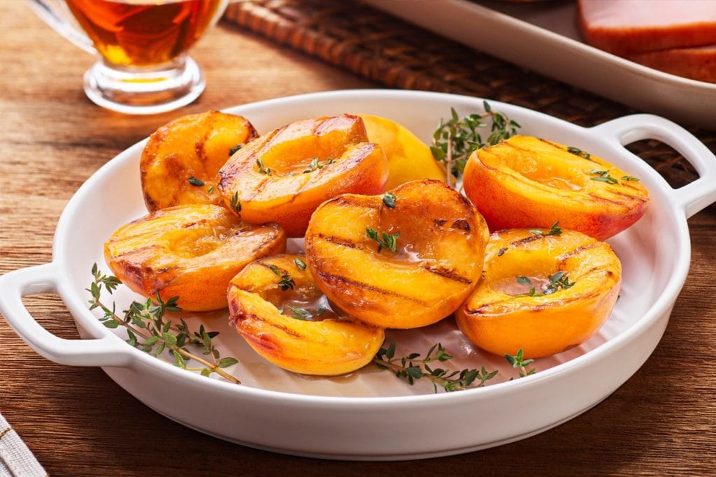 - Aqueça uma frigideira ou chapa de ferro com fundo chanfrado (tipo bistequeira), unte com azeite e coloque os pêssegos com a parte cortada voltados para baixo.