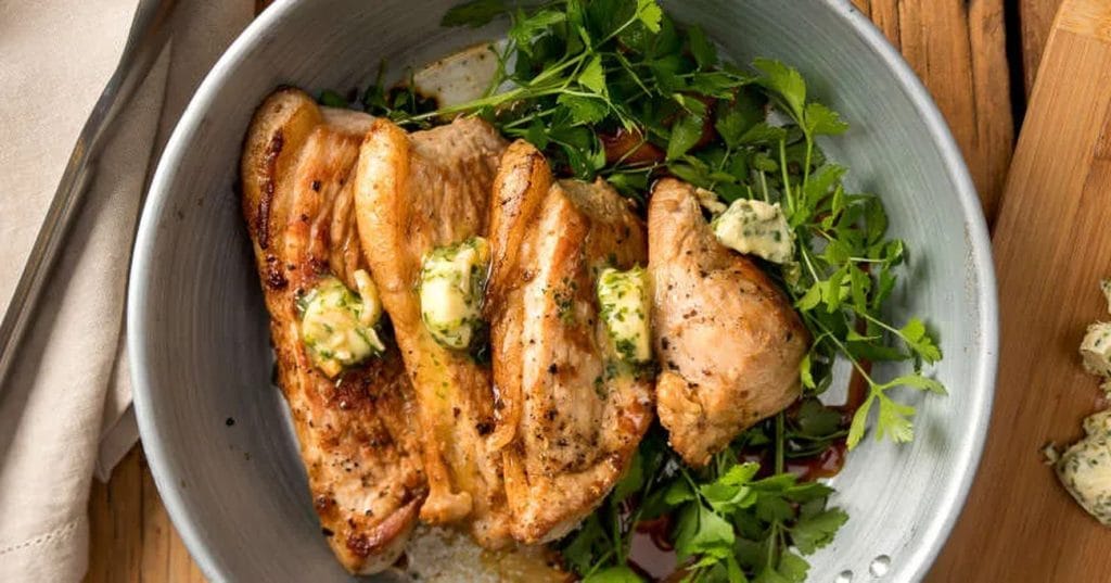 - Finalmente, sirva as picanhas com a manteiga aromatizada por cima. Você pode derreter um pouco a manteiga na frigideira onde as picanhas foram grelhadas, para que ela absorva todos os sabores restantes, e então colocá-la sobre as picanhas. Esse toque final é o que torna a Picanha Suína com Pasta de Alho e Salsa verdadeiramente especial.