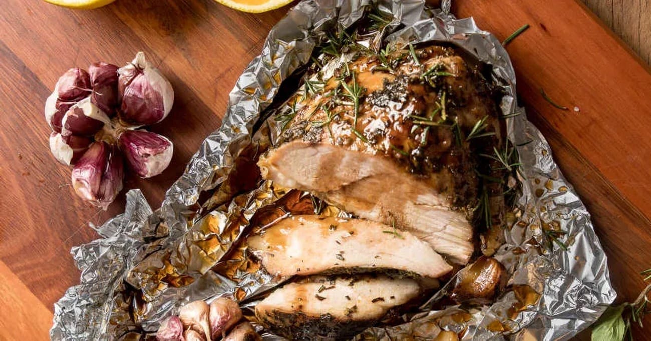 - Após 30 minutos, abra o papel-alumínio da carne e regue-a com o suco das laranjas.