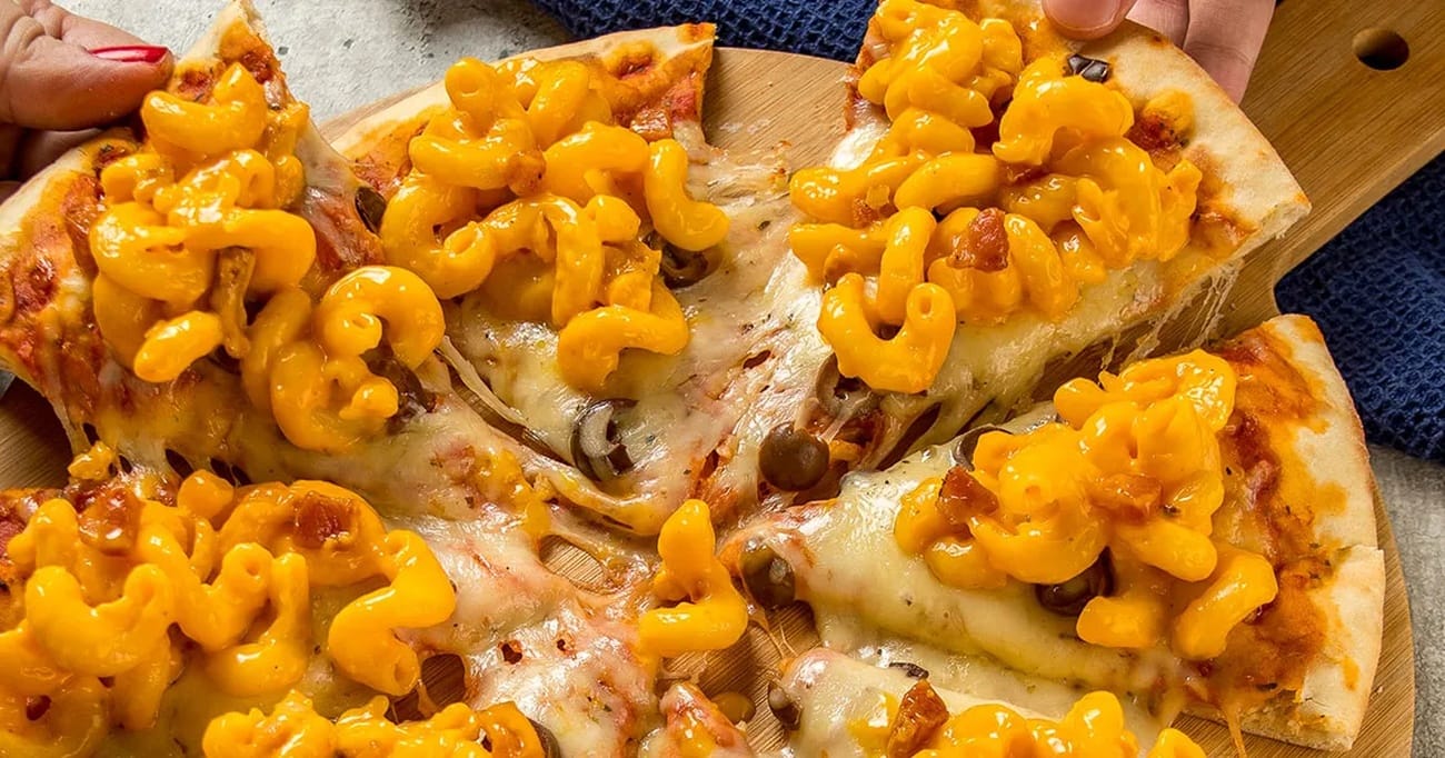 - Para a montagem, retire a pizza do forno e coloque-a em uma forma ou prato grande. Em seguida, Cubra a pizza com o Mac’n Cheese já cozido e bem quente.