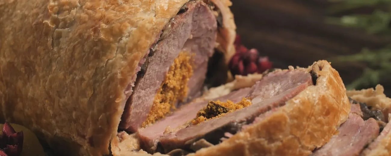 - Para a copa lombo à wellington, coloque a copa lombo em uma assadeira e cubra com massa folhada. Leve ao forno por cerca de 25 minutos, ou até que a massa esteja dourada.