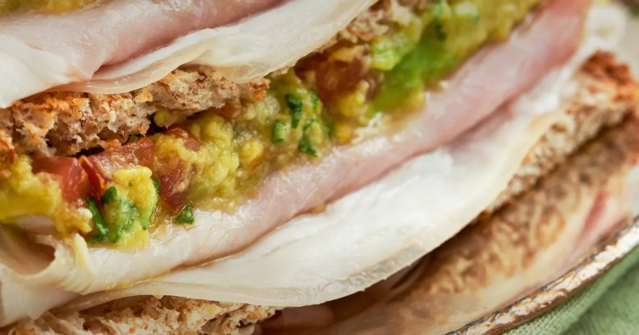- Pegue uma das metades do pão torrado, coloque uma fatia de presunto dobrado e uma colher de sopa da mistura de abacate. Por cima, coloque a outra metade do pão, mais uma fatia de presunto e finalize com mais uma colher do creme de abacate. Essa montagem permite que cada ingrediente seja apreciado em sua textura e sabor, enquanto a combinação dos mesmos cria um prato coerente e delicioso.