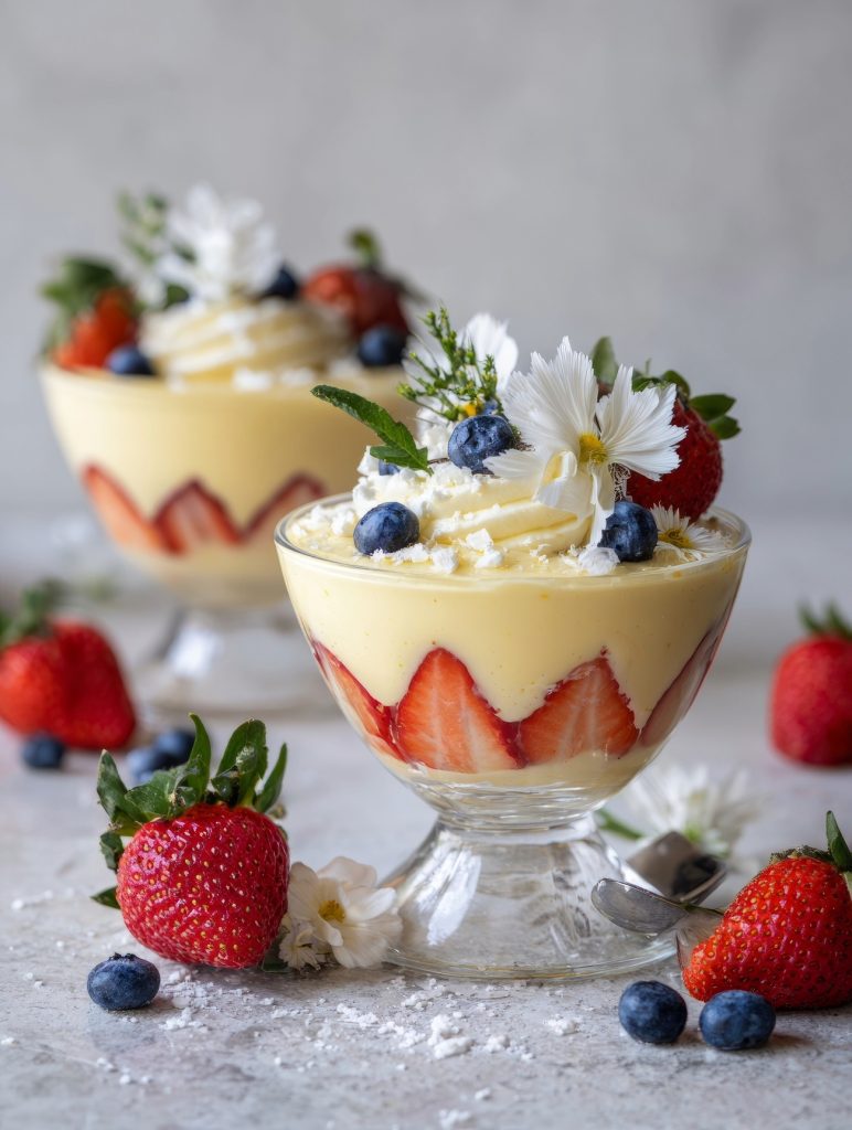 - Adicione os morangos cortados ao meio sobre o creme.