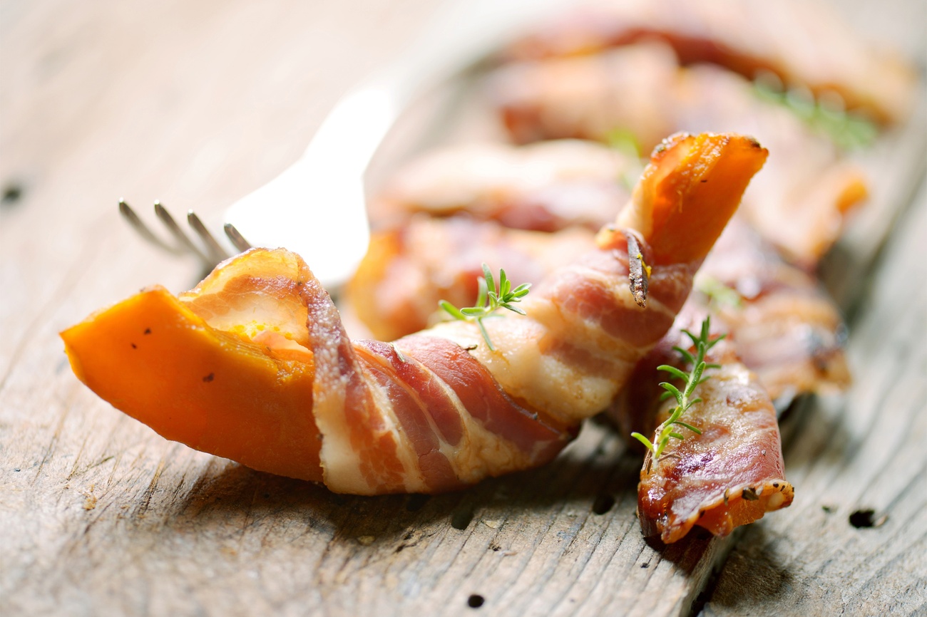 - Em um recipiente apropriado, corte o bacon, a cebola e a abóbora, com o auxílio de uma faca. Reserve-os para usar mais tarde.