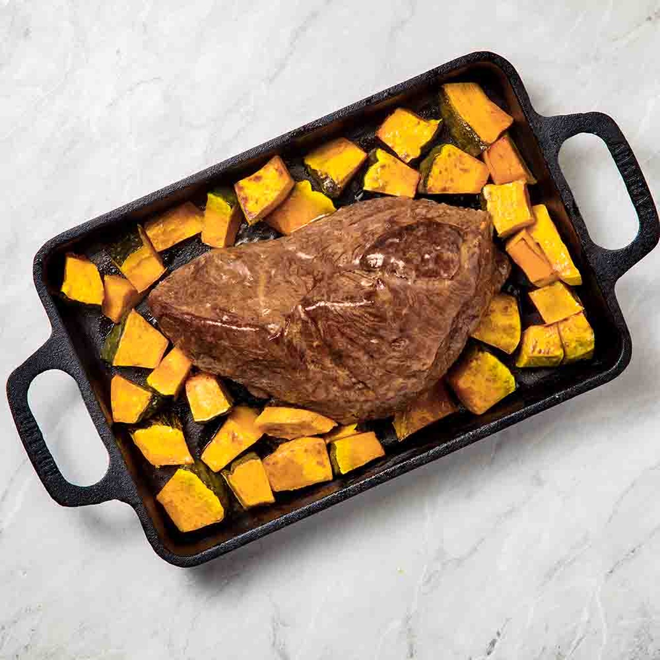 - Quando a abóbora estiver pronta, retire-a do forno e aguarde a carne finalizar o seu tempo de descanso antes de servir.