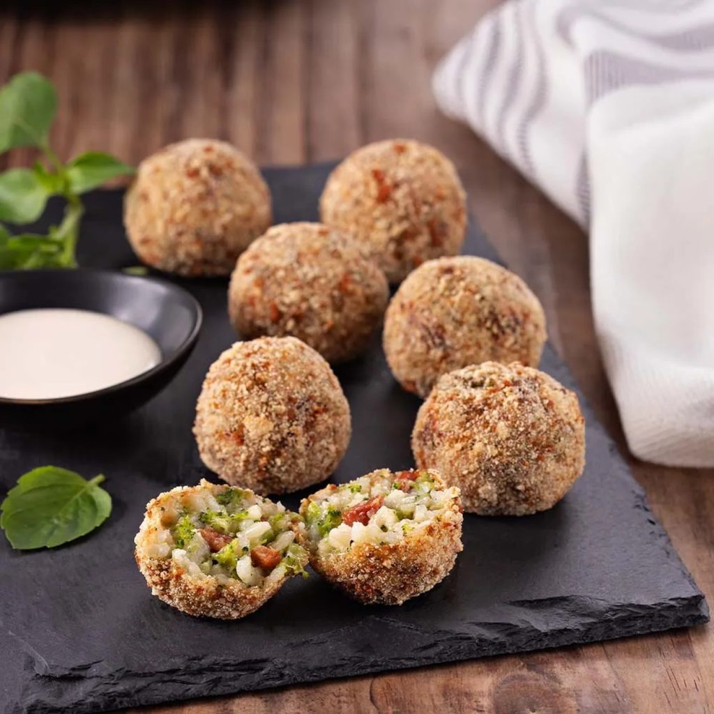 - Molde toda a massa de arroz em bolinhas, passe no ovo e na farofa. Refrigere por mais 30 minutos. A farofa apimentada adiciona um toque crocante e um pouco de picância aos arancini.