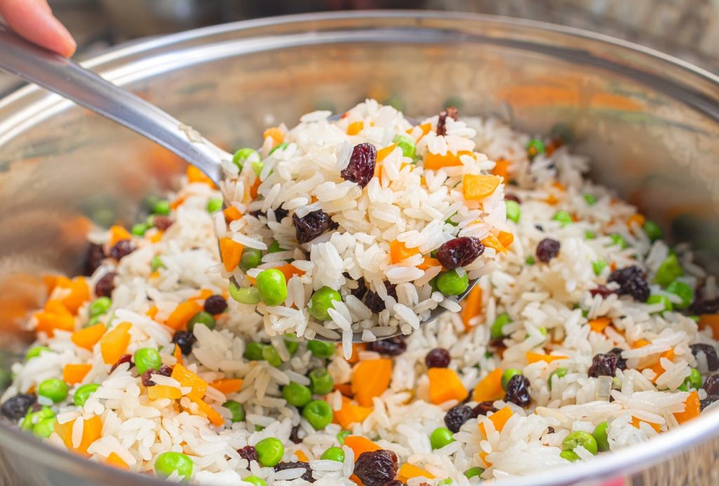 - Em um recipiente grande, acrescente o arroz cozido e adicione as uvas-passas, a cenoura ralada, a ervilha com milho verde e o cheiro verde. Misture tudo com cuidado para que os ingredientes fiquem bem distribuídos.