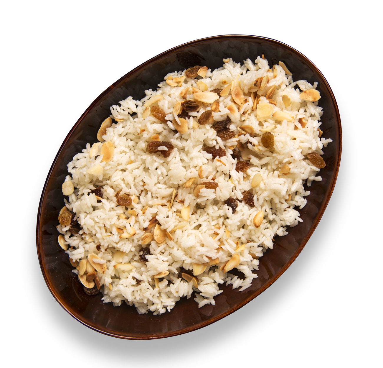 - Quando o arroz estiver pronto, retire a panela do fogo. Adicione as uvas passas e as amêndoas picadas, misturando suavemente.