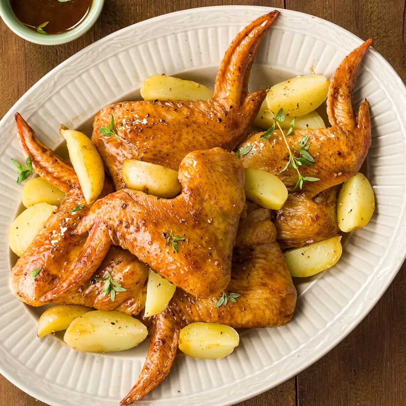 - Espalhe o tomilho por cima das asinhas e batatas.