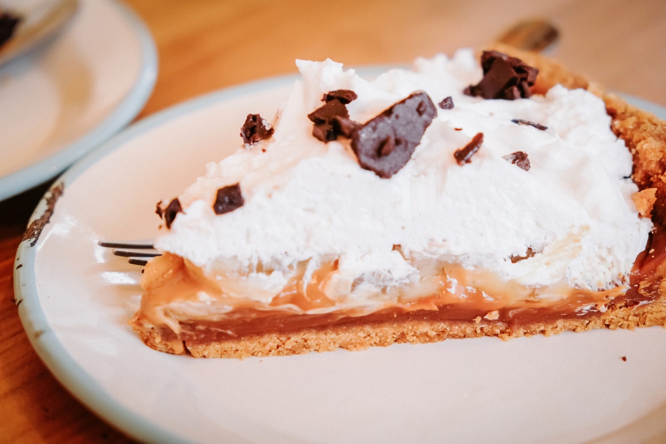 - Distribua as rodelas de banana por cima e cubra com o chantilly com chocolate.
