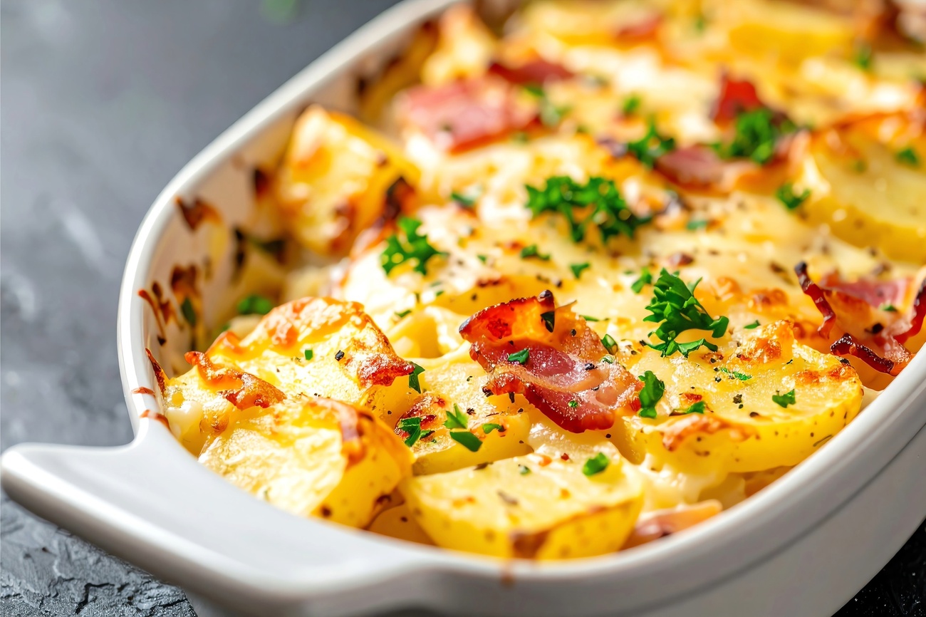 - Em um refratário, faça uma camada com as batatas cozidas. Despeje o molho de bacon e NESTLÉ Creme de Leite por cima das batatas, espalhando uniformemente para que cada pedaço fique coberto. É importante que as batatas estejam bem cobertas para absorver todos os sabores.