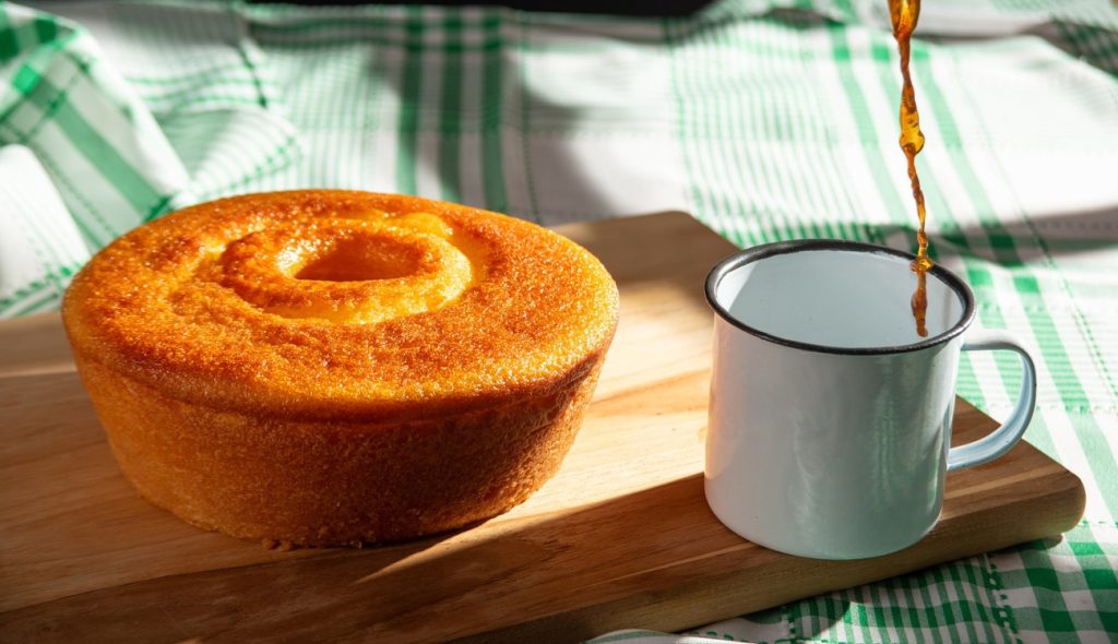 - Preeaqueça o forno em temperatura média (180°C) e unte uma forma de furo central (24 cm de diâmetro) com manteiga e polvilhe com farinha de trigo. Essa etapa é essencial para garantir que o bolo não grude na forma e para dar uma textura crocante na parte exterior.