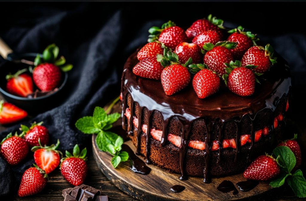 - Em um movimento uniforme, cubra todo o bolo com a ganache de chocolate e finalize a decoração com os morangos reservados.
