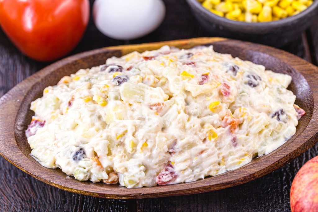 - Acrescente, aos poucos, a maionese e tempere com MAGGI Fondor, misturando delicadamente até que todos os ingredientes estejam bem envolvidos e com uma textura cremosa.