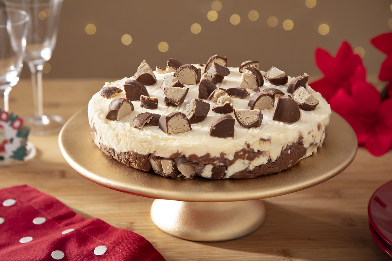 - Desenforme e adicione o restante dos bombons Serenata de Amor por cima. Essa etapa final é onde você pode ser criativo e decorar o bolo sorvete da maneira que preferir.