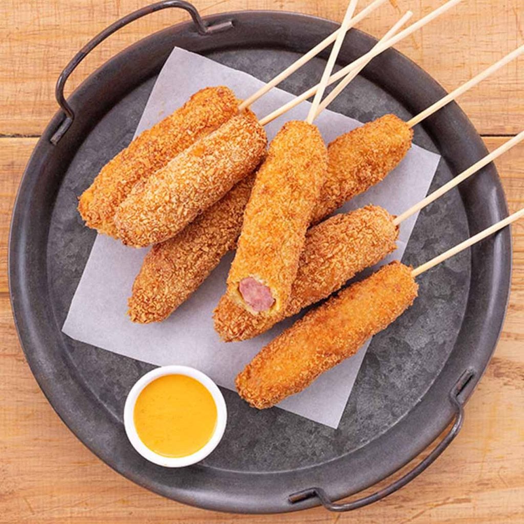 - Mergulhe os espetos na massa, passe-os pela farinha panko para empanar e, em seguida, frite até que fiquem dourados. Isso deve ser feito com cuidado para evitar acidentes.