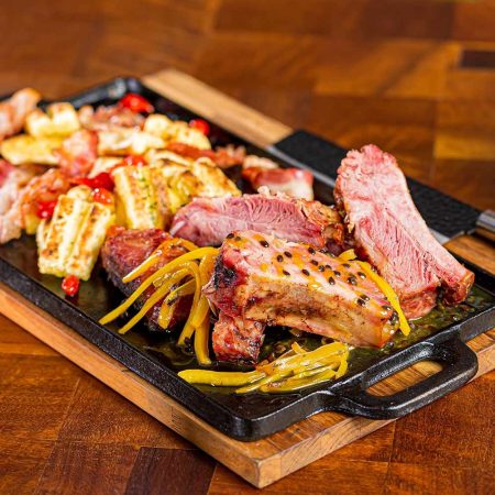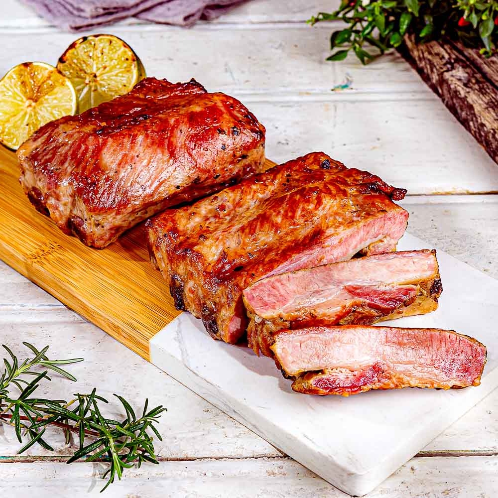 7. Sirva o limão grelhado, a farofa tradicional e a costela suína assada ainda quente. A combinação desses elementos vai criar uma experiência gastronômica completa e deliciosa.