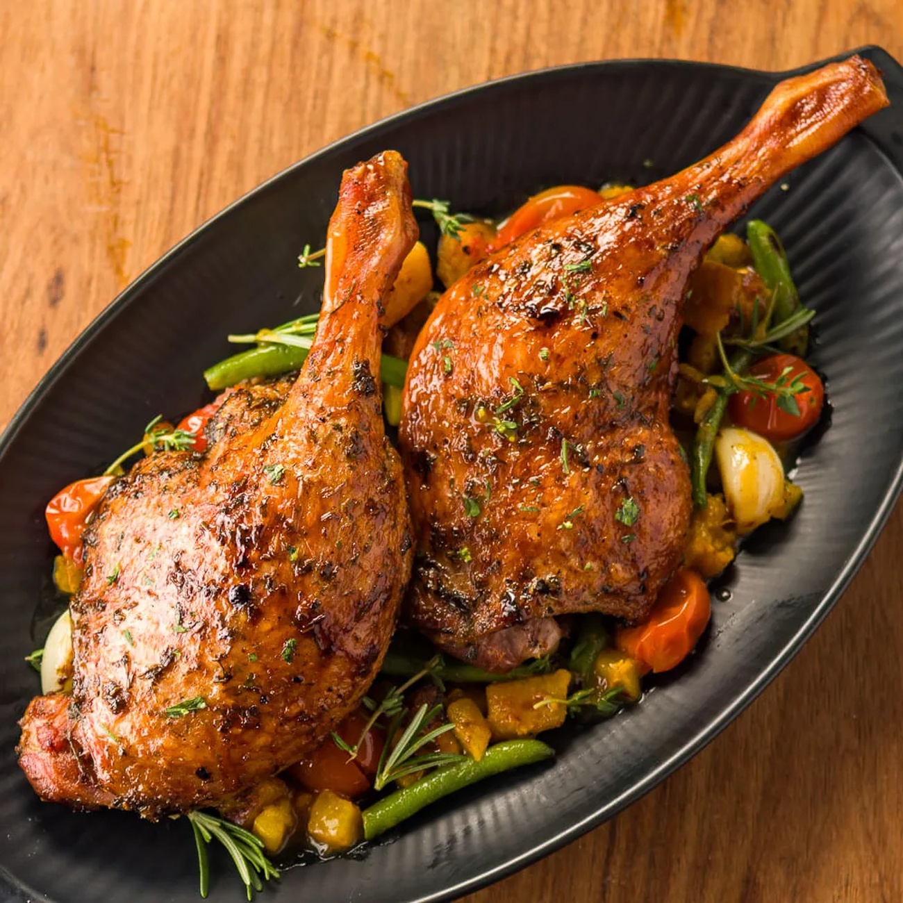 - Em uma travessa, organize os legumes de forma atraente, e acrescente a coxa e sobrecoxa de pato assada por cima. Regue tudo com o molho de laranja que foi preparado anteriormente, garantindo que cada pedaço esteja coberto com esse delicioso e aromático molho.