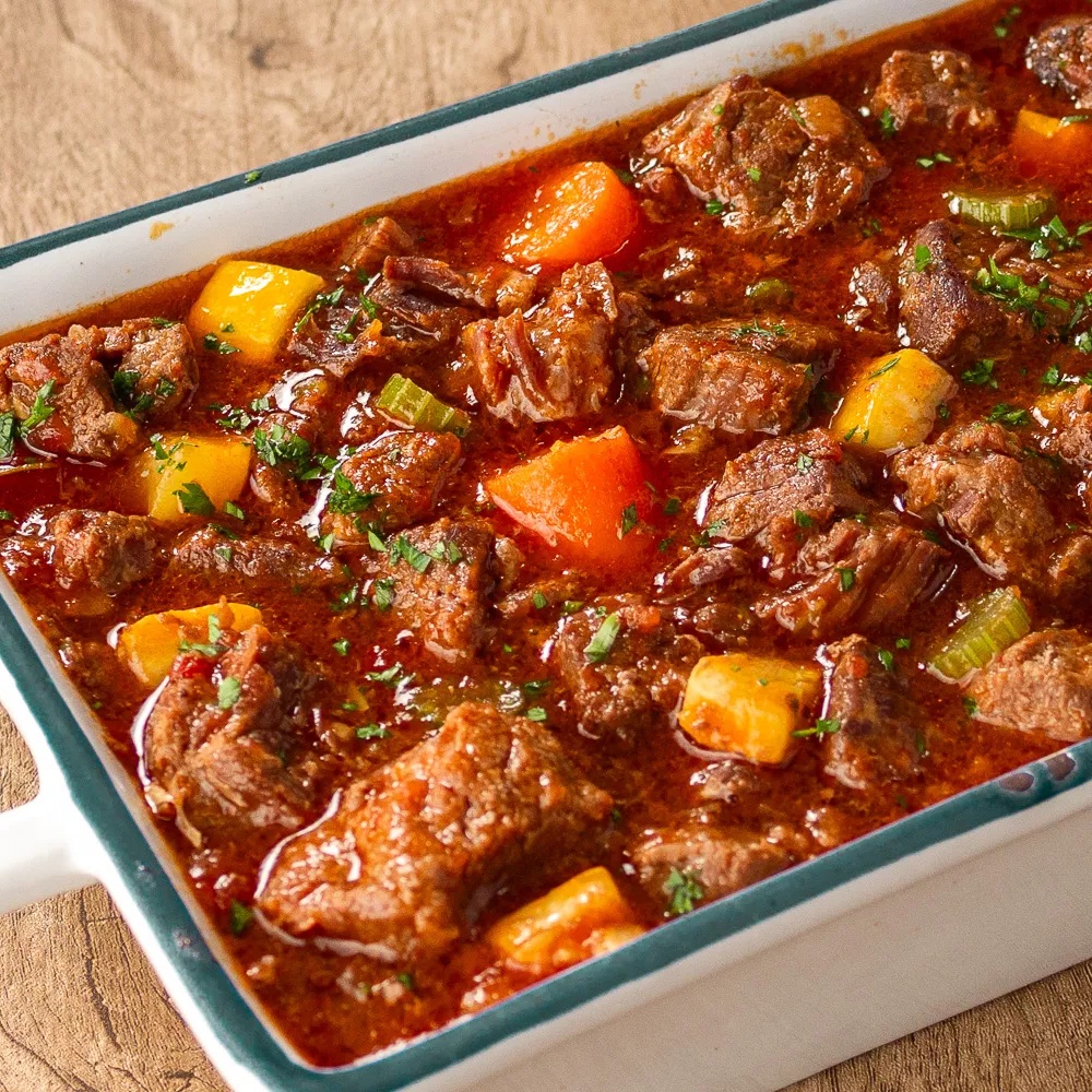 - Volte a carne para a panela e deixe cozinhar em fogo baixo até que a carne e as cenouras fiquem macias. Isso pode levar cerca de 30 minutos, dependendo do tamanho dos cubos de carne e da sua preferência de textura.