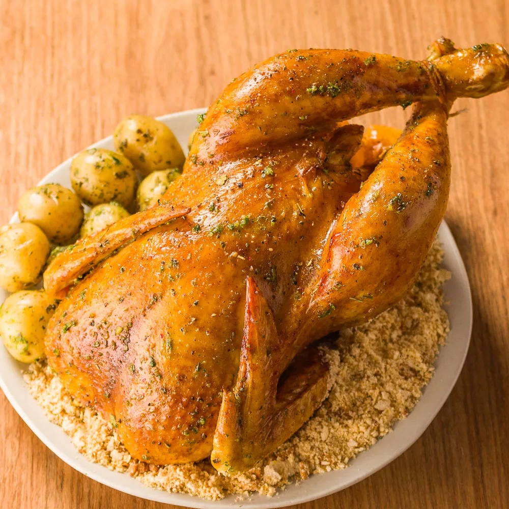 - Em uma assadeira, coloque o frango caipira e tempere-o com sal, pimenta e mix de ervas finas. Em seguida, leve-o ao forno pré-aquecido a 180° por 2 horas, aproximadamente. É importante ter paciência, pois o tempo de cozimento é fundamental para que o frango fique macio e saboroso.