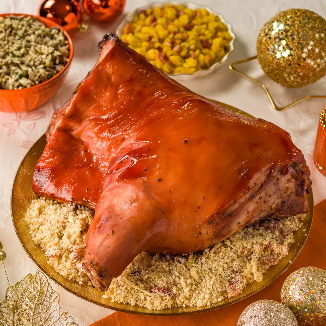 - Finalize a mandioquinha com salsinha picada e sirva acompanhada da farofa de bacon, arroz de lentilhas e o leitão assado.