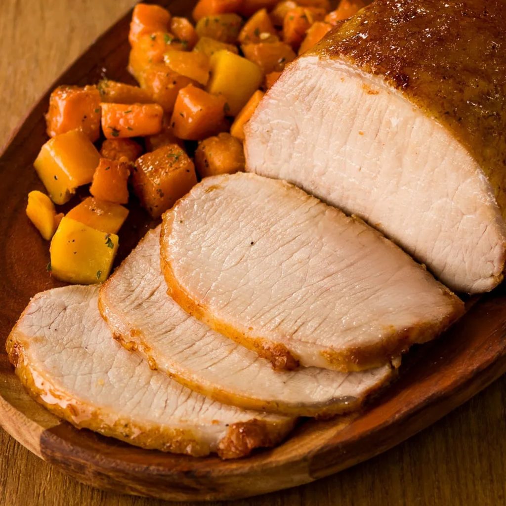 - Comece temperando a peça de lombo suíno com sal, mix de pimentas e tempero para suínos. Deixe descansar por 20 minutos para que os temperos apurem.