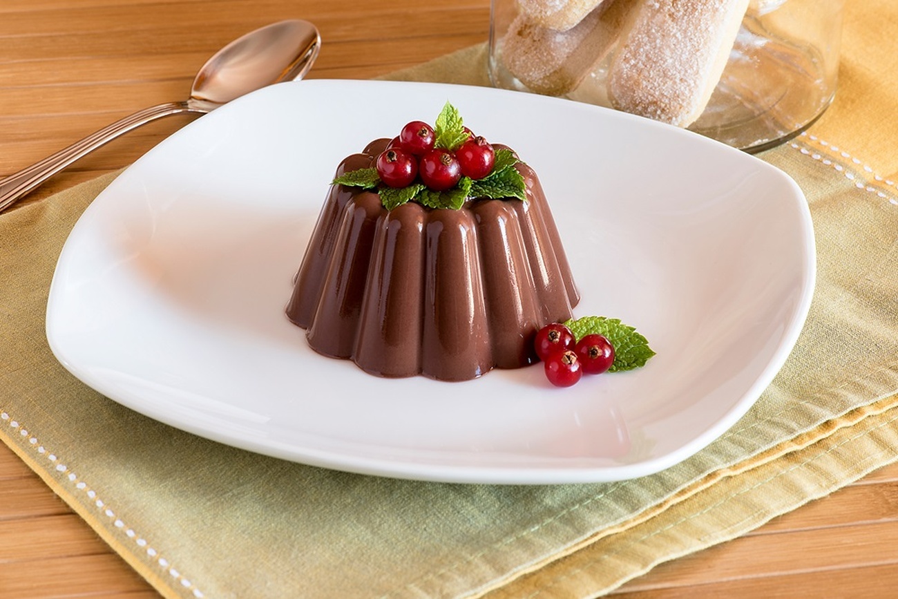 - Após o tempo de geladeira, desenforme o manjar. Para decorar, você pode adicionar coco ralado, raspas de chocolate, calda de chocolate e cereja por cima.