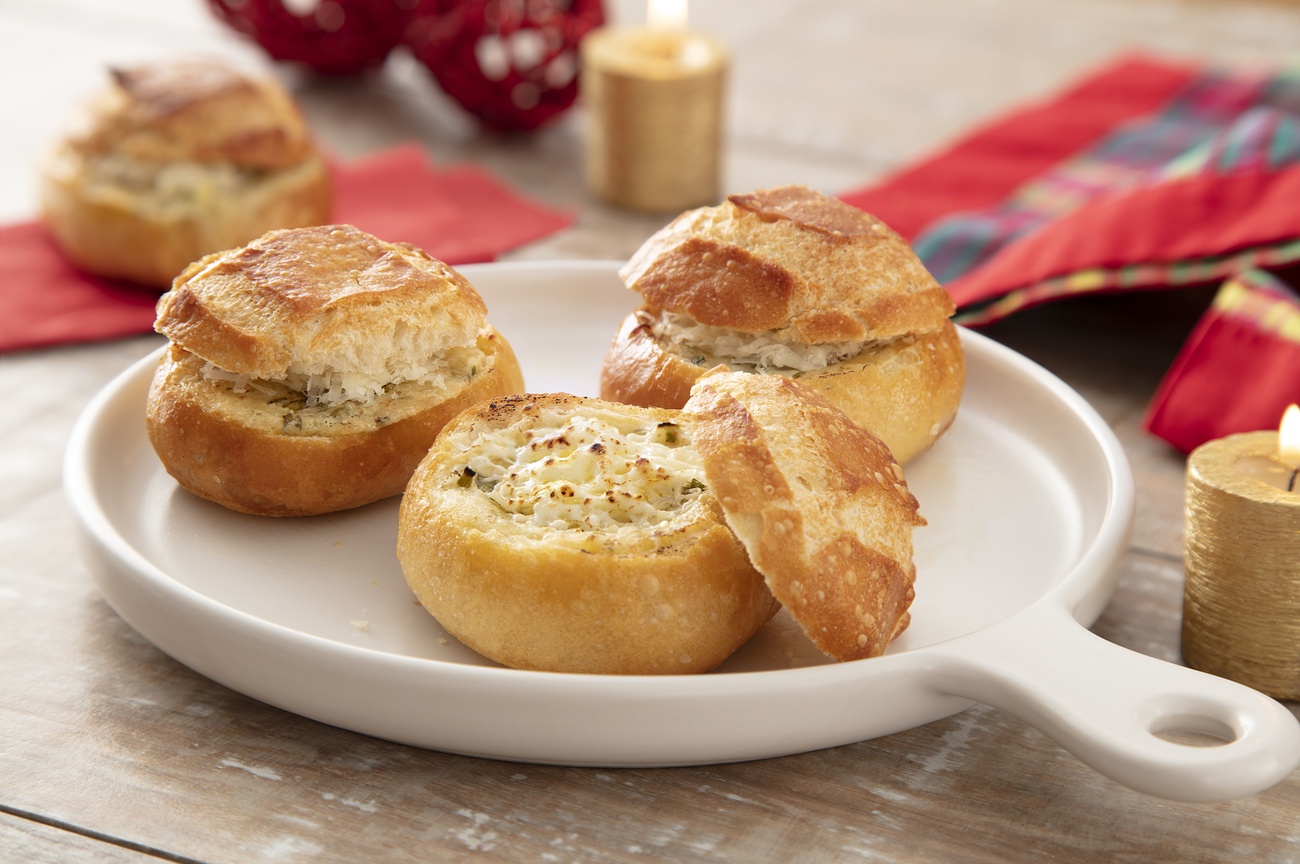 - Abra os pães no topo, removendo uma tampa e um pouco do miolo. Recheie-os com a pasta de alho e coloque-os no cesto da Air Fryer preaquecida a 180ºC. Deixe cozinhar por cerca de 5 a 10 minutos, ou até que a pasta esteja quente e dourada.