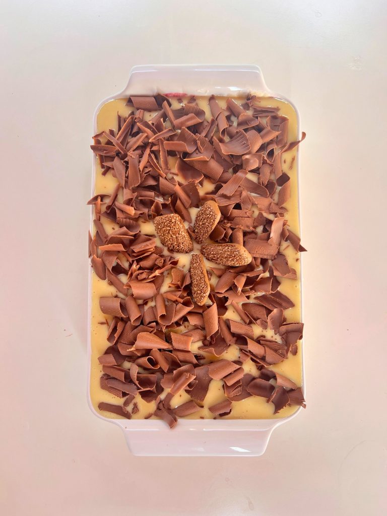 - Em um recipiente refratário, espalhe o brigadeiro de Leite Ninho reservado. Em seguida, umedeça os biscoitos champanhe no Leite Líquido NINHO Forti+ Integral e disponha-os sobre o brigadeiro.