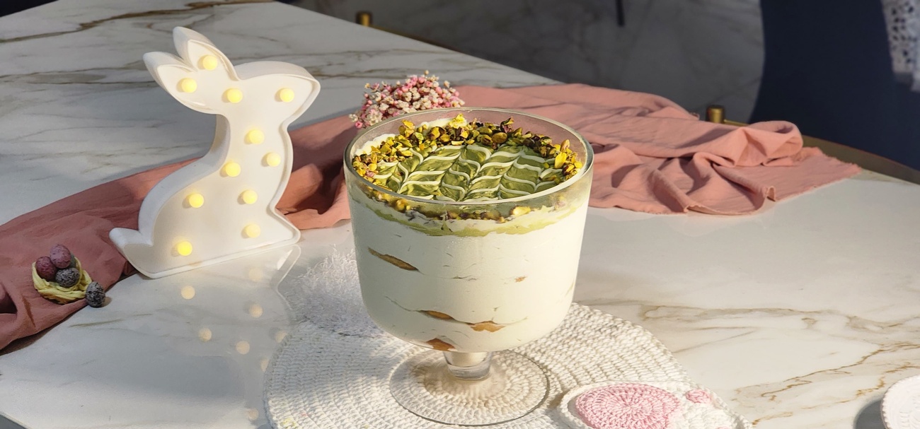 - Em um recipiente próprio para micro-ondas, derreta o chocolate GALAK em intervalos de 30 segundos, mexendo bem a cada intervalo até que esteja completamente derretido. Misture a pasta de pistache ao chocolate derretido e reserve. Essa combinação de sabores é fundamental para o pavê.