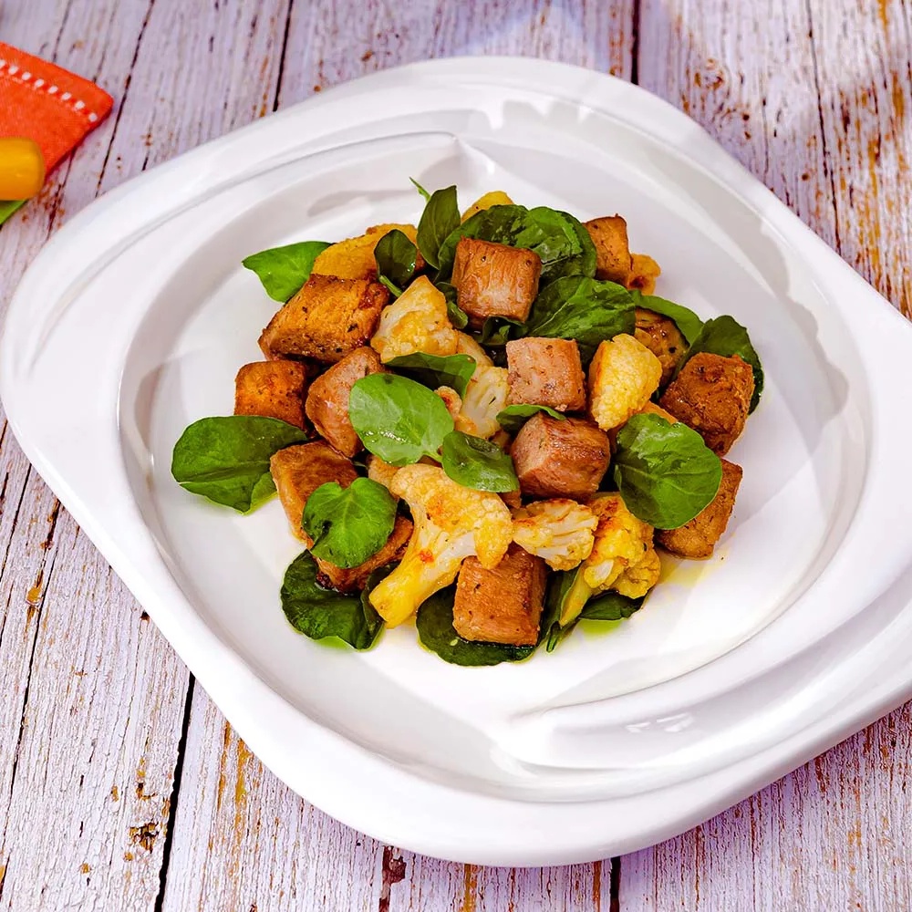 - Para finalizar, em um prato, faça uma base de folhas de agrião, disponha a couve-flor salteada, os cubos de pernil cozidos e finalize com um fio de azeite para dar um toque especial ao prato.