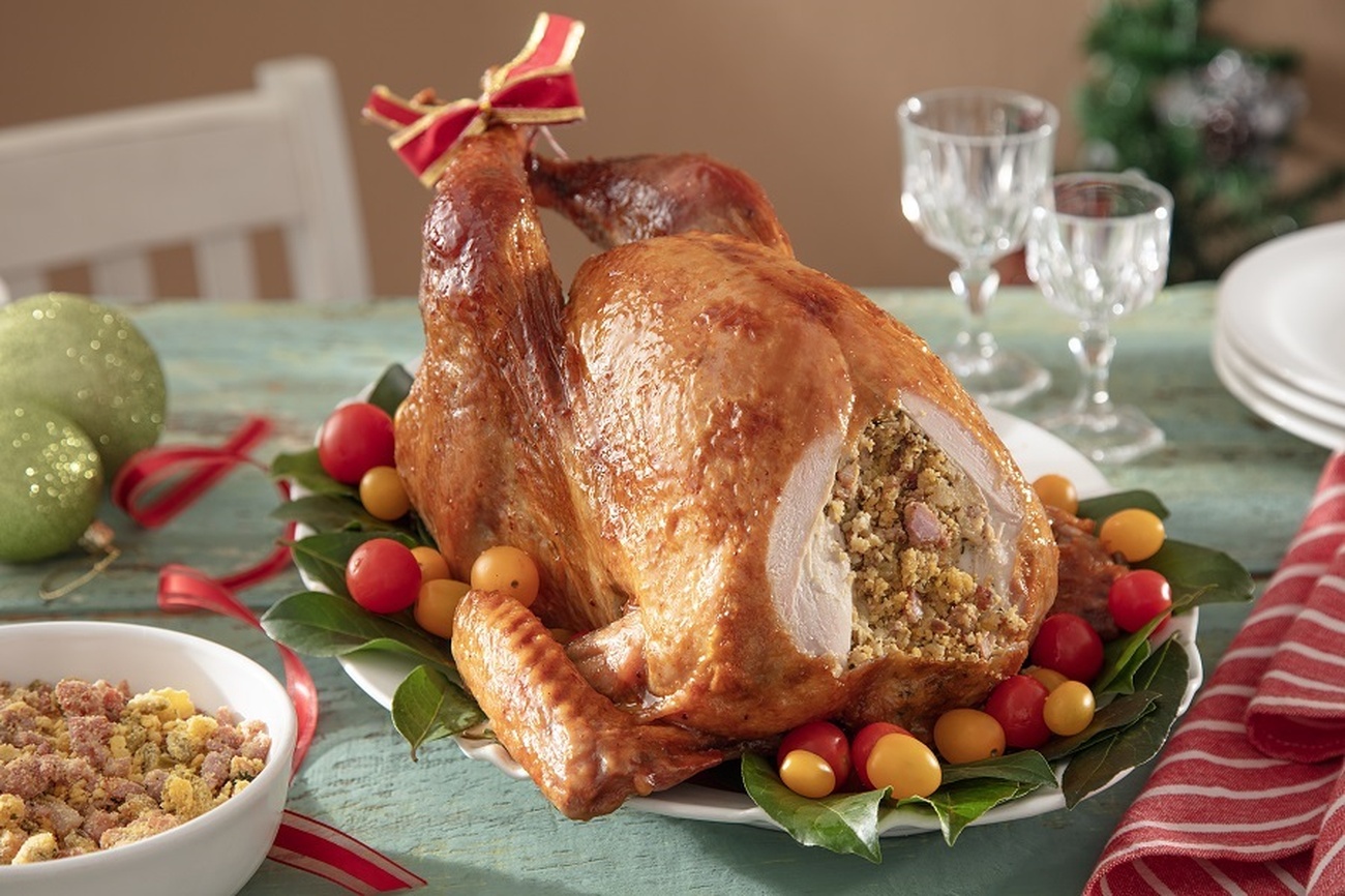 - Com o peru já temperado e preparado, recheie-o com a farofa. Certifique-se de não superlotar o peru, permitindo que o calor circule durante o cozimento e que a farofa cozinhe uniformemente.