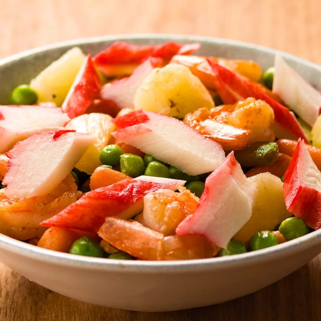- Em uma tigela para servir, coloque os camarões reservados, o refogado de ervilhas, cenoura e abacaxi, e corte grosseiramente as fatias de Kani Kama. A textura do Kani Kama é um ponto alto dessa salada, então é importante não picá-lo demais para manter a sua estrutura.