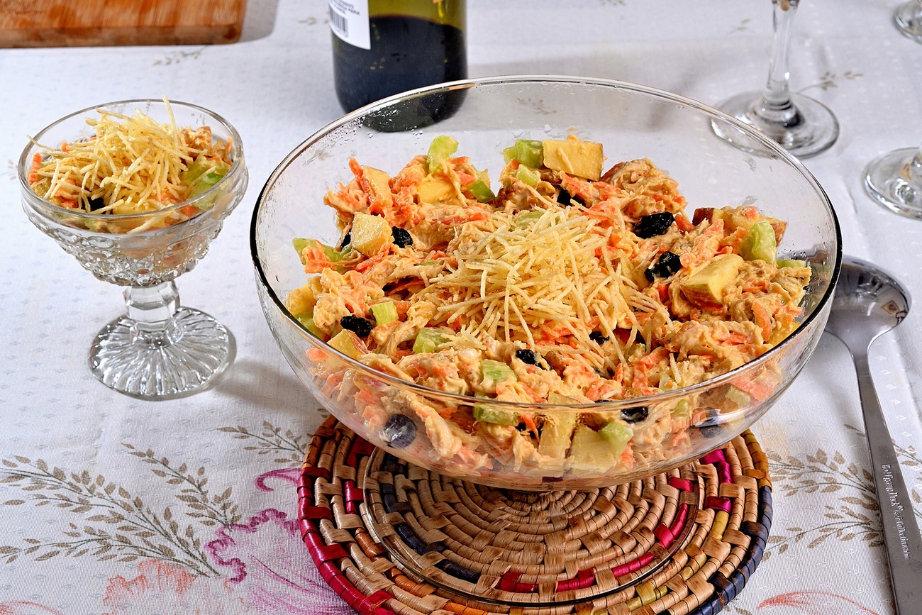 - Finalmente, é hora de servir o Salpicão de Natal. Coloque o prato em uma travessa ou prato individual e cubra com batata-palha por cima. A textura crocante da batata-palha complementa perfeitamente a suavidade do salpicão, criando um contraste delicioso.
